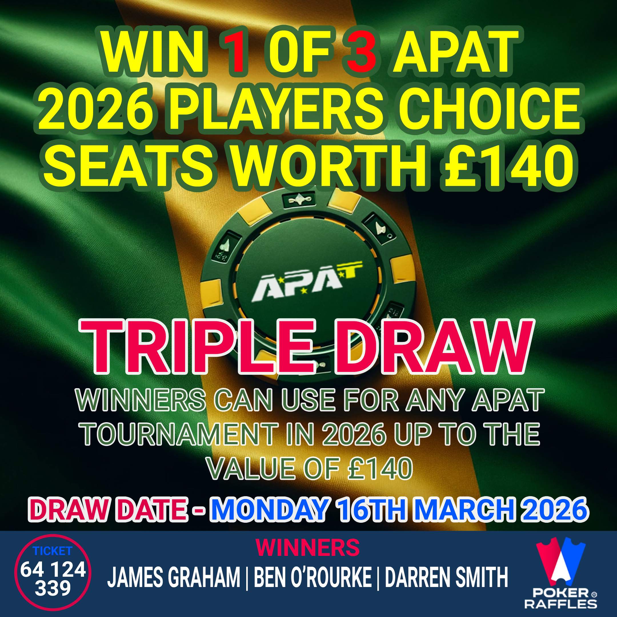 Ticket holders in this raffle will be competing to win 1 of 3 Seats at any £140 main event in 2026, or any similarly priced APAT National Amateur Poker Championship event in 2026.
