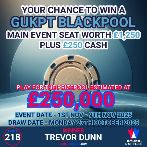 Poker Raffles are giving you the chance to win a £1,250 Main Event seat for the iconic GUKPT Blackpool in November 2025, plus £250 cash to cover expenses.