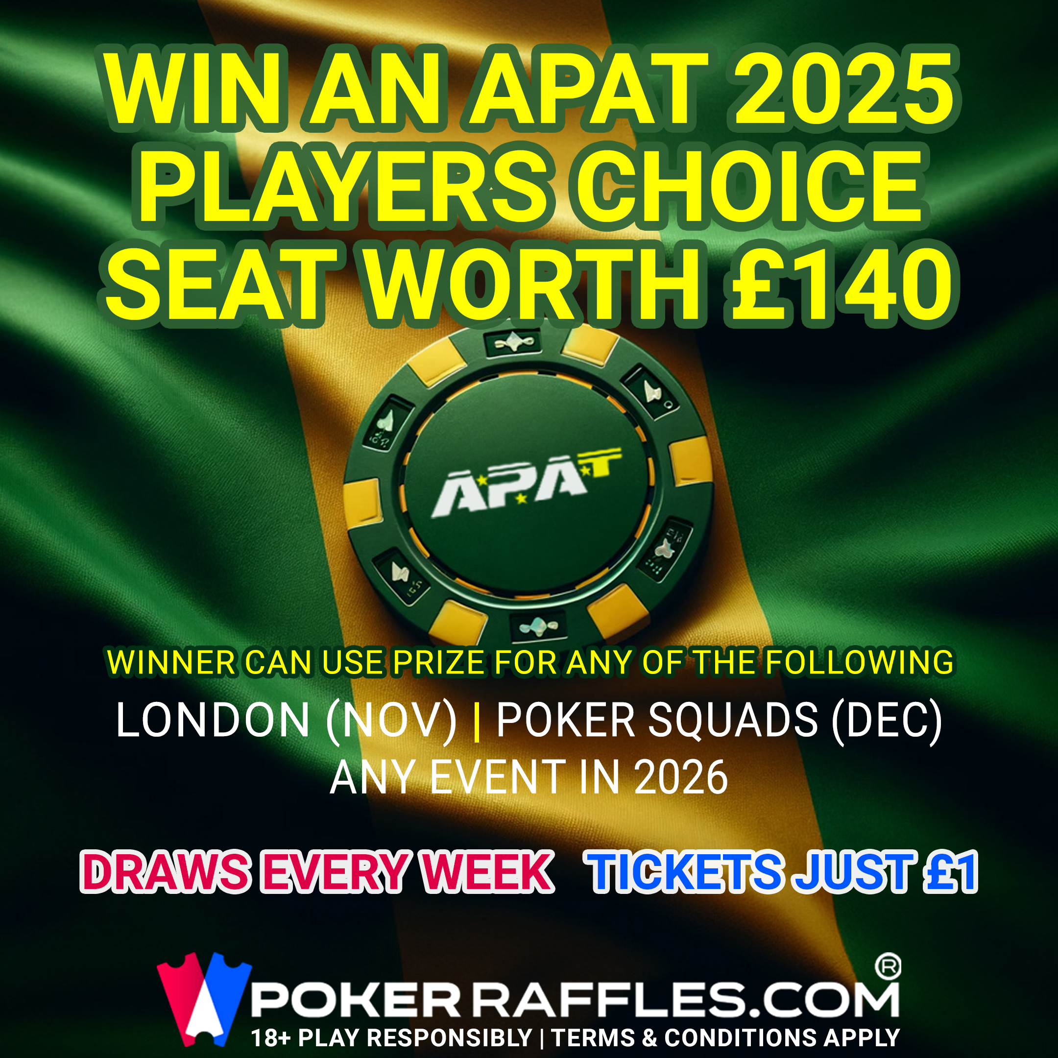 Ticket holders in this raffle will be competing to win a Seat at any £140 main event in 2025, or any similarly priced APAT National Amateur Poker Championship event in 2025.