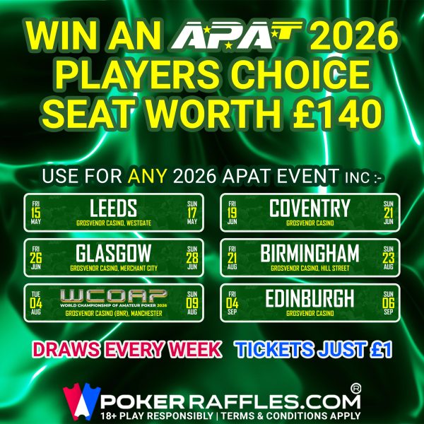 Ticket holders in this raffle will be competing to win a Seat at any £140 main event in 2026, or any similarly priced APAT National Amateur Poker Championship event in 2026.